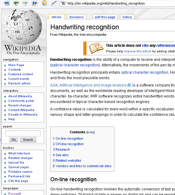 Страница "Распознавание рукописного ввода" в Wikipedia на русском языке